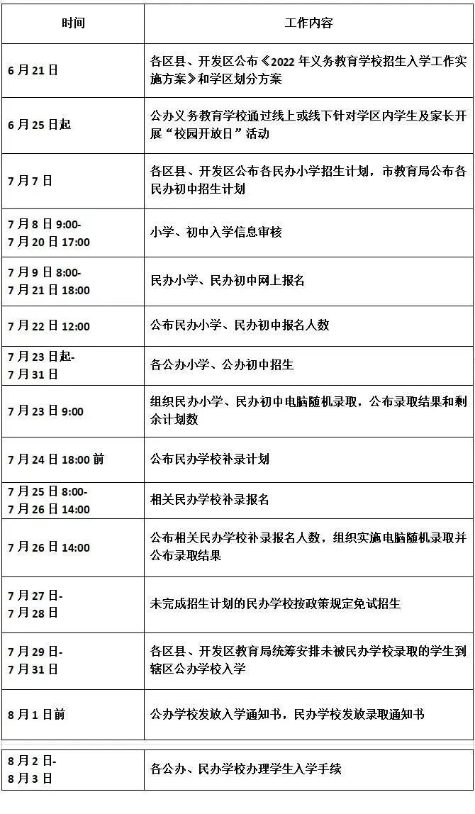 6月21日,各區縣、開發區公布義務教育招生入學工作實施方案和學區劃分方案,相關信息可在各區縣政府、開發區管委會門戶網站及其教育局微信公眾號查詢。